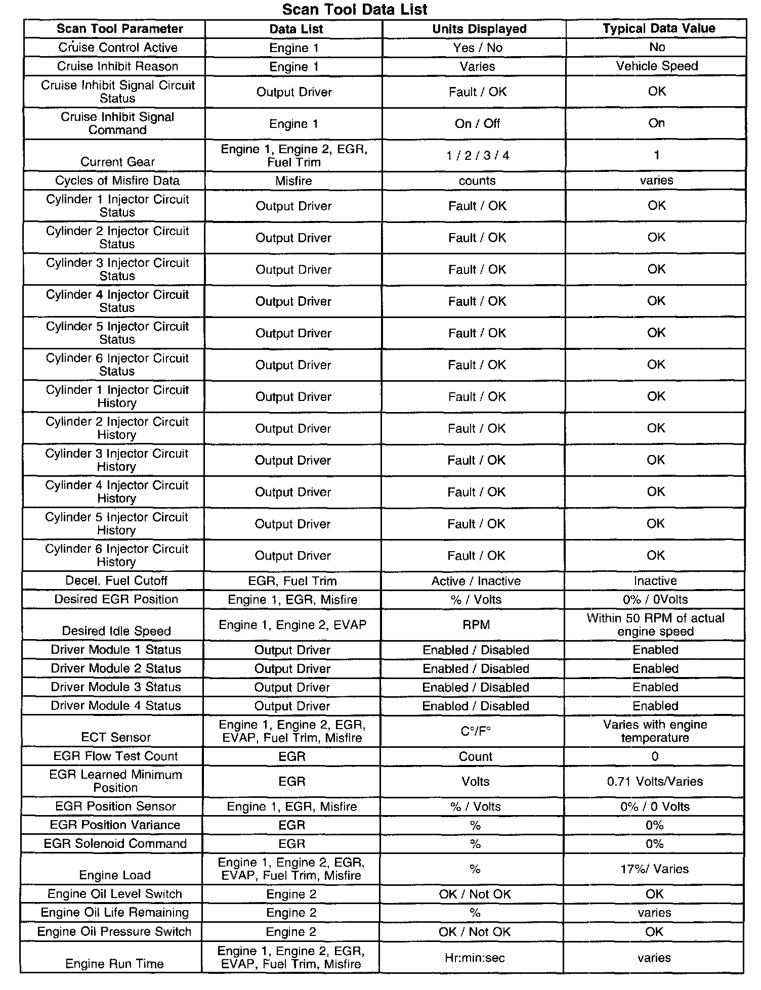 - EGR Data-Contains information specific to the Exhaust Gas Recirculation (EGR) system. This list displays parameters required to verify proper EGR system operation