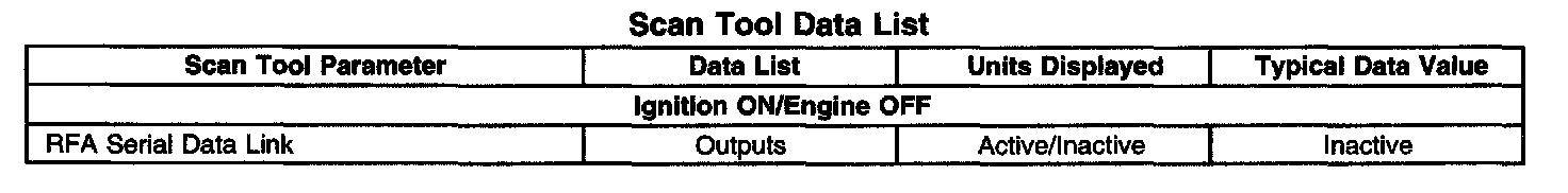The Keyless Entry Scan Tool Data List contains all of the keyless entry related parameters that are available on the scan tool. The parameters in the list are arranged in alphabetical order. The column, "Data List," indicates the location of the parameter within the scan tool menu selections. Use the Keyless Entry Scan Tool Data List as directed by a diagnostic table or in order to supplement the diagnostic procedures. Begin all of the diagnostic procedures with Diagnostic System Check - Remote keyless Entry.