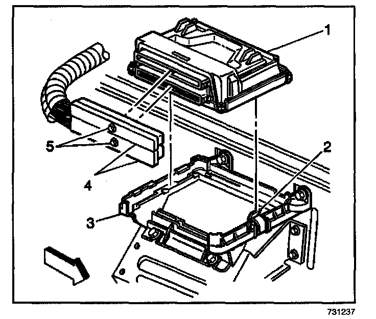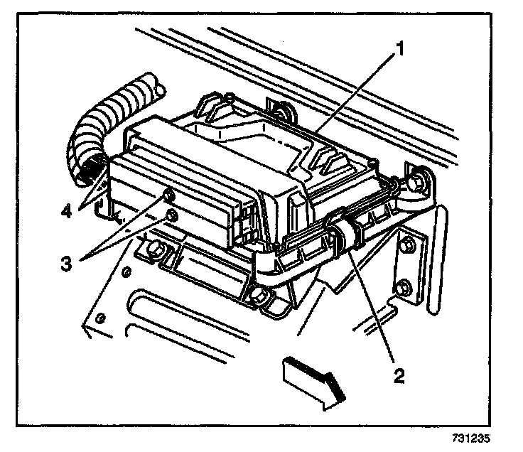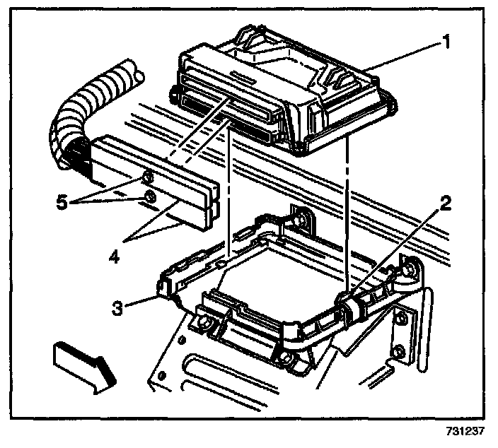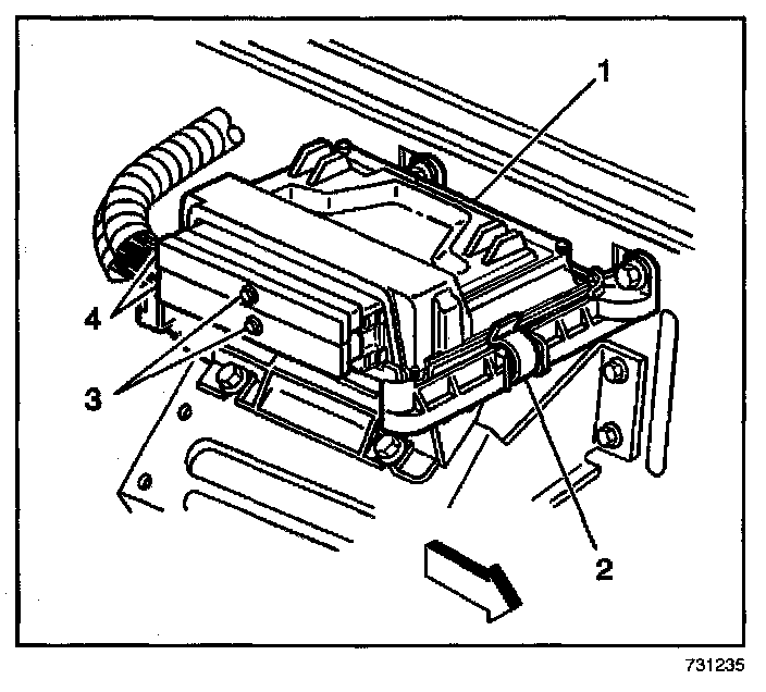 1. Install the PCM (1) to the PCM mounting bracket (3) ensuring that the PCM is engaged in the mounting tabs.