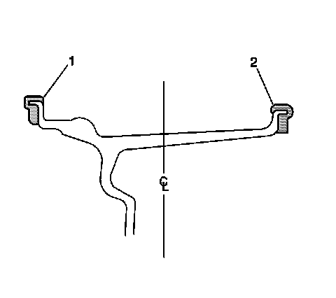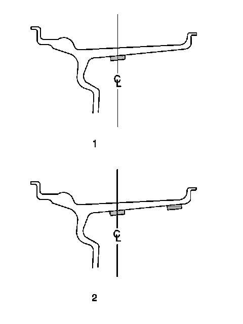 Adhesive wheel weights (1, 2) may also be used on aluminum wheels. Use the following procedure in order to install adhesive wheel weights.