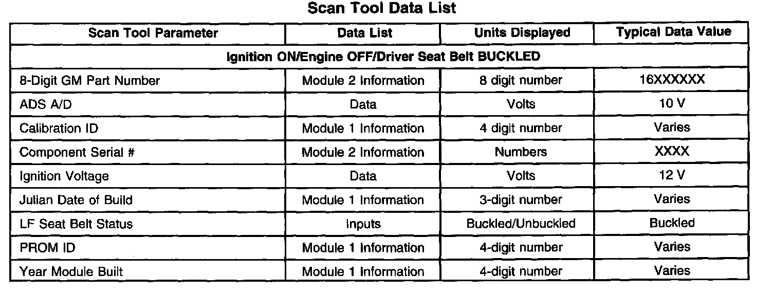 Use the SIR Scan Tool Data List as directed by a diagnostic table or to supplement the diagnostic procedures. Begin all of the diagnostic procedures with the Diagnostic System Check - Restraint Systems. Refer to the Diagnostic System Check - Restraint Systems. Use the SIR Scan Tool Data List after determining the following:
