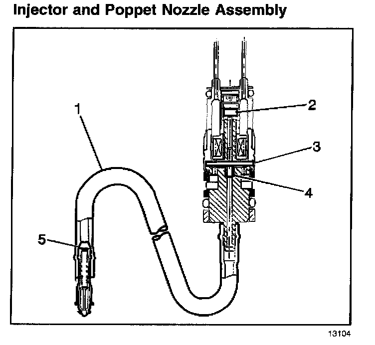 Each fuel injector assembly is a solenoid operated device, controlled by the control module. The fuel injector assembly meters the pressurized fuel through a poppet nozzle valve (5) to a single engine cylinder. The control module energizes the flow control solenoid (2), which opens an armature valve (3). Fuel is allowed to flow past the valve and through a flexible fuel pipe (1) to the poppet nozzle valve. An increase in fuel pressure causes the poppet nozzle ball to open from a seat against the extension spring force. This allows the fuel to flow from the nozzle.
