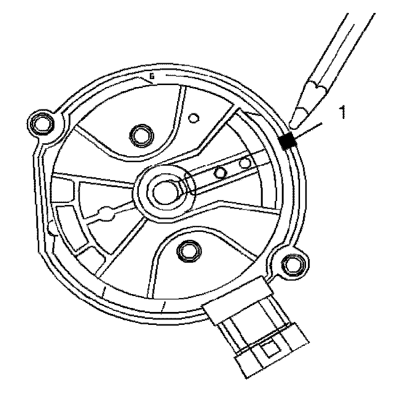 7. Once the distributor is completely seated, the rotor segment should be aligned with the mark on the distributor base (1).