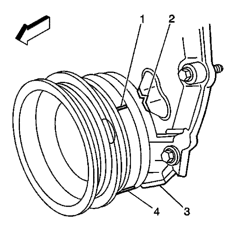 Important: Rotate the number 1 cylinder to top dead center (TDC) of the compression stroke. The engine front cover has 2 alignment tabs and the crankshaft balancer has 2 alignment marks spaced 90 degrees apart which are used for positioning the number 1 piston at TDC. With the piston on the compression stroke and at TDC, the crankshaft balancer alignment mark (1) must align with the engine front cover tab (2) and the crankshaft balancer alignment mark (4) must align with the engine front cover tab (3).