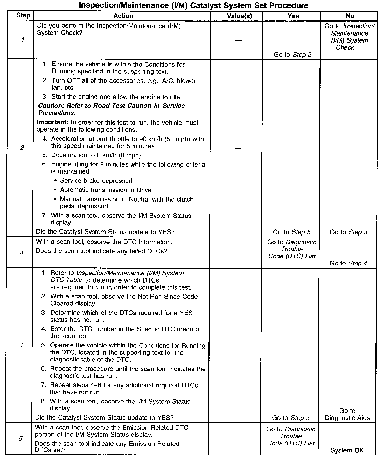 DESCRIPTIONThe purpose of this test is to satisfy the enable criteria necessary to execute I/M readiness diagnostics for the catalyst system. The test may be used to set the I/M System Status indicators to YES. Ensure the vehicle meets the requirements listed in Conditions for Running before performing this test. Failure to meet the necessary requirements may produce inaccurate test results.