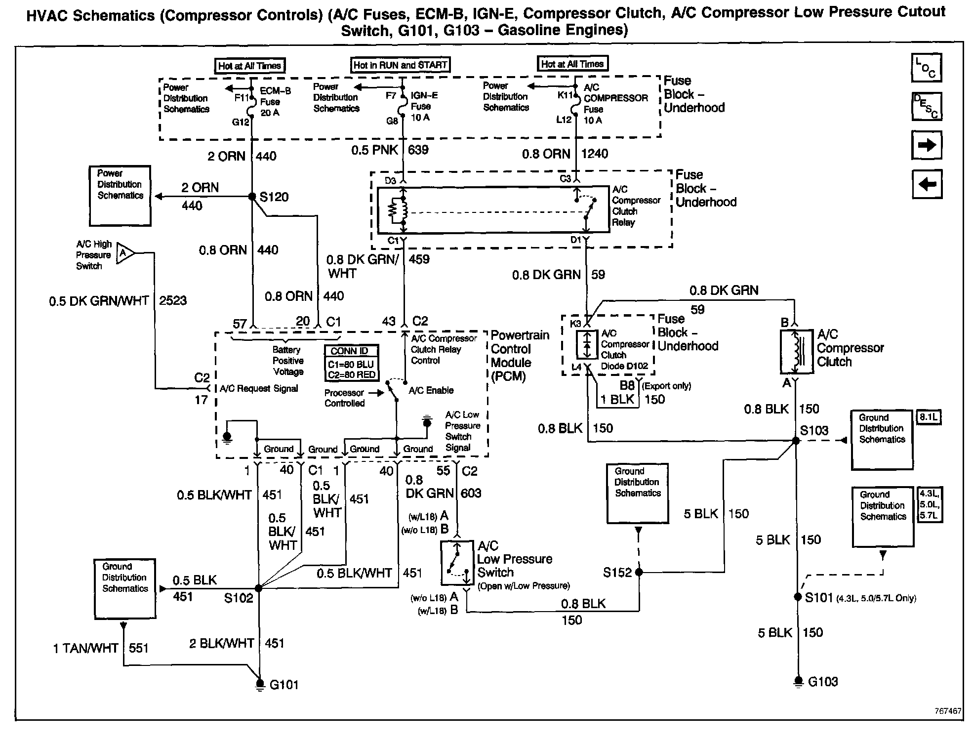 HVAC Schematics: Compressor Controls (A/C Fuses, ECM-B, IGN-E, Compressor Clutch, A/C Compressor Low Pressure Cutout Switch, G101, G103 - Gasoline Engines):
