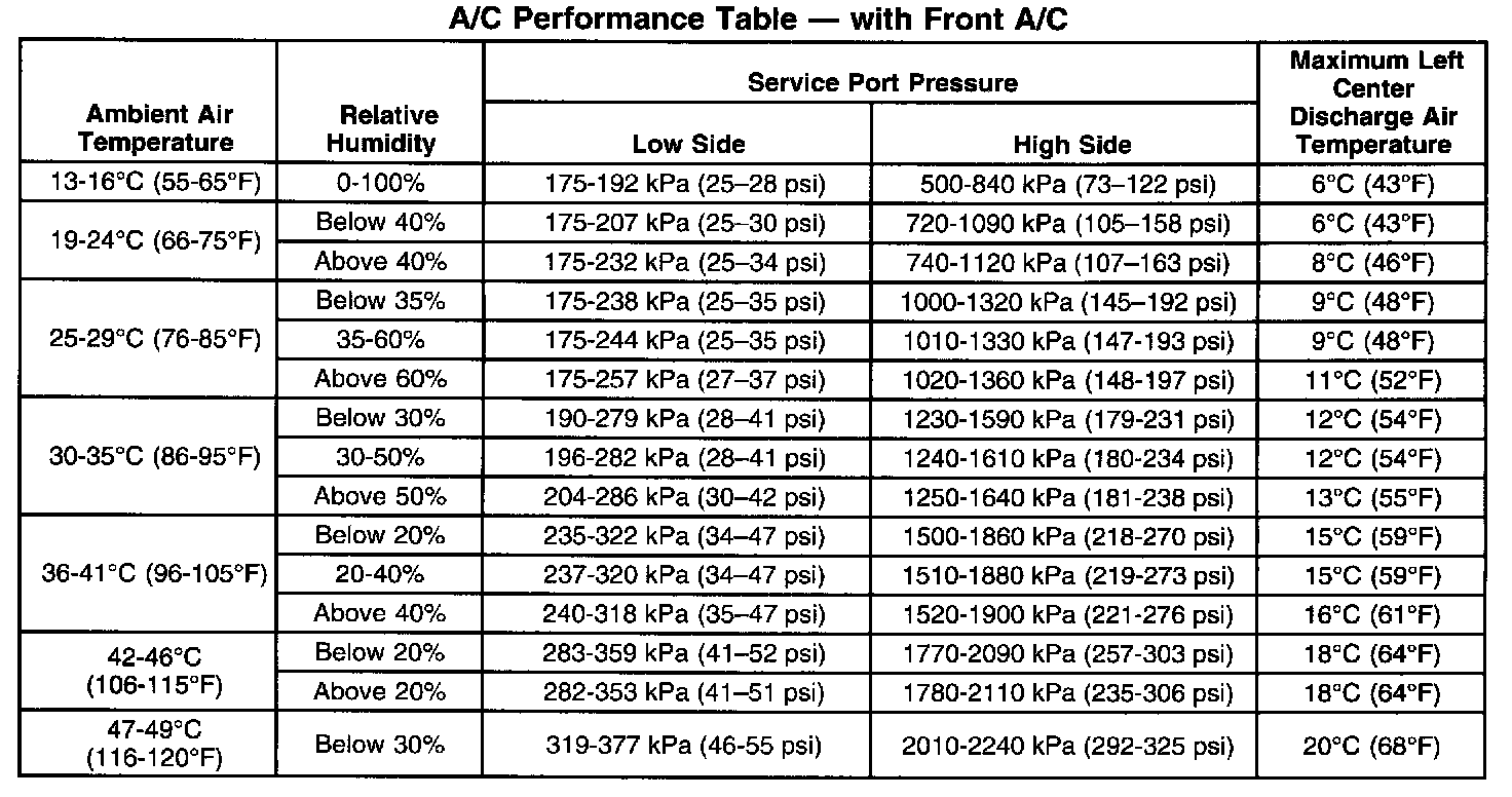 A/C Performance Table - With Front A/C: