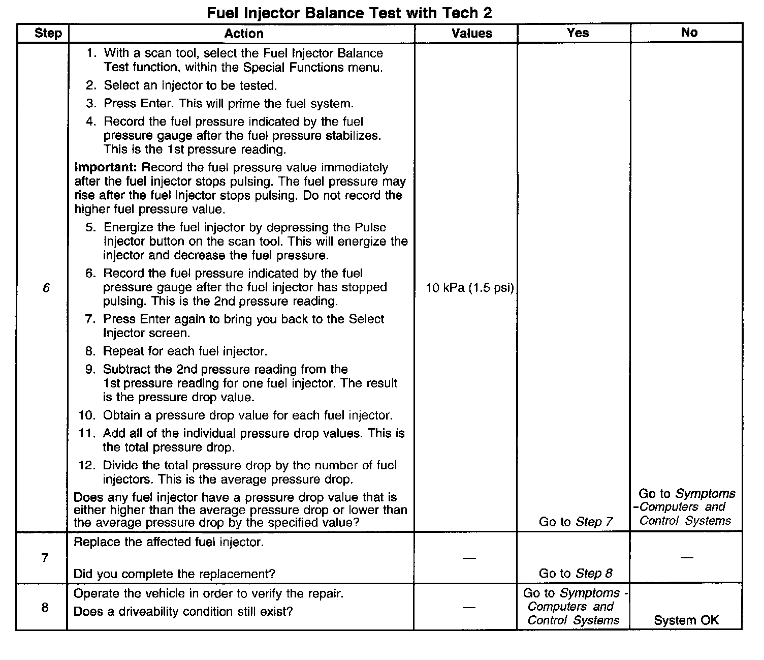 6. If the pressure drop value for each fuel injector is within 10 kPa (1.5 psi) of the average pressure drop value, the fuel injectors are flowing properly. Calculate the pressure drop value for each fuel injector by subtracting the second pressure reading from the first pressure reading.