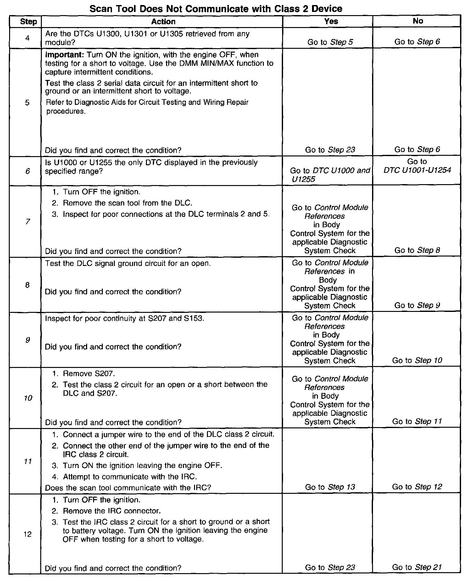 11. The class 2 circuit is shorted to battery positive voltage or ground. The condition may be due to the wiring or due to a malfunction in one of the modules. When testing the wiring for a short, make sure there is not a module connected to the wire being tested. This test isolates the IRC class 2 circuit.