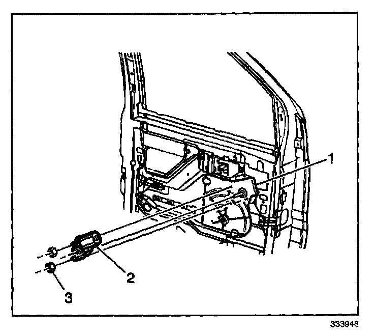 2. Install the nuts (3) in order to retain the power window motor (2) to the front door module (1).