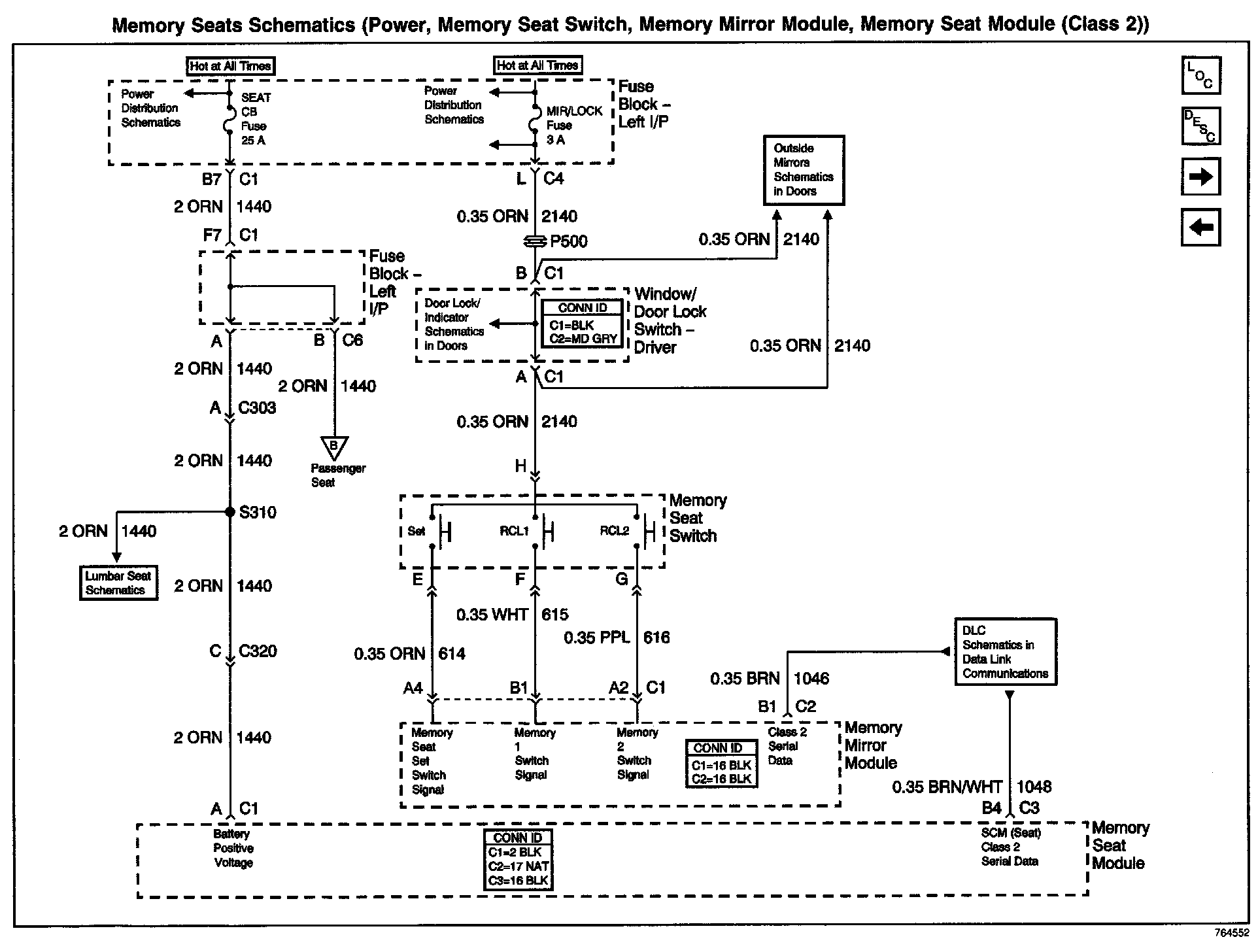 Memory Seats Schematics (Power, Memory Seat Switch, Memory Mirror Module, Memory Seat Module (Class 2)):