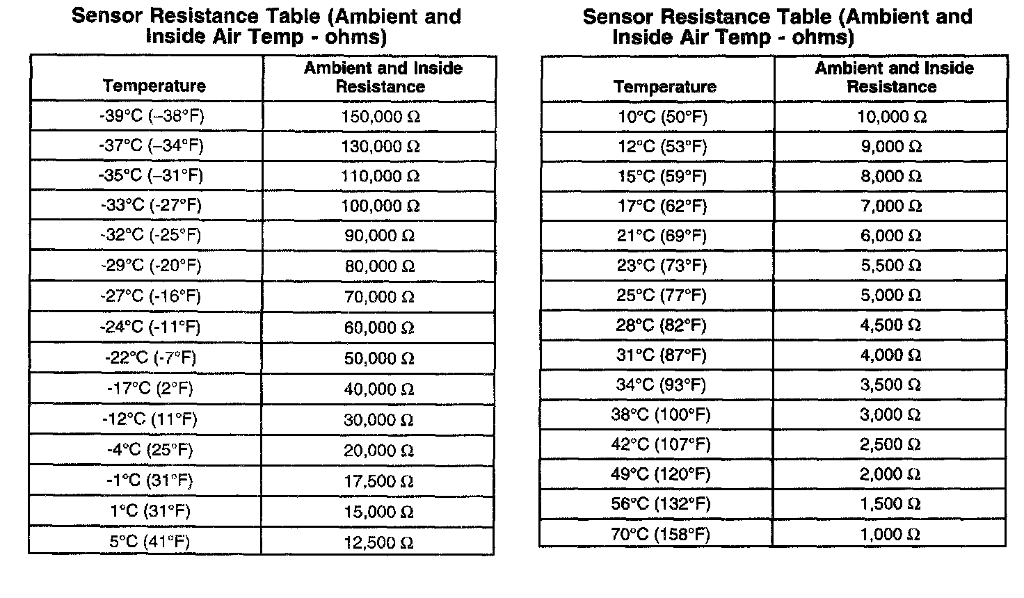 Sensor Resistance Table (Ambient And Inside Air Temp - Ohms):