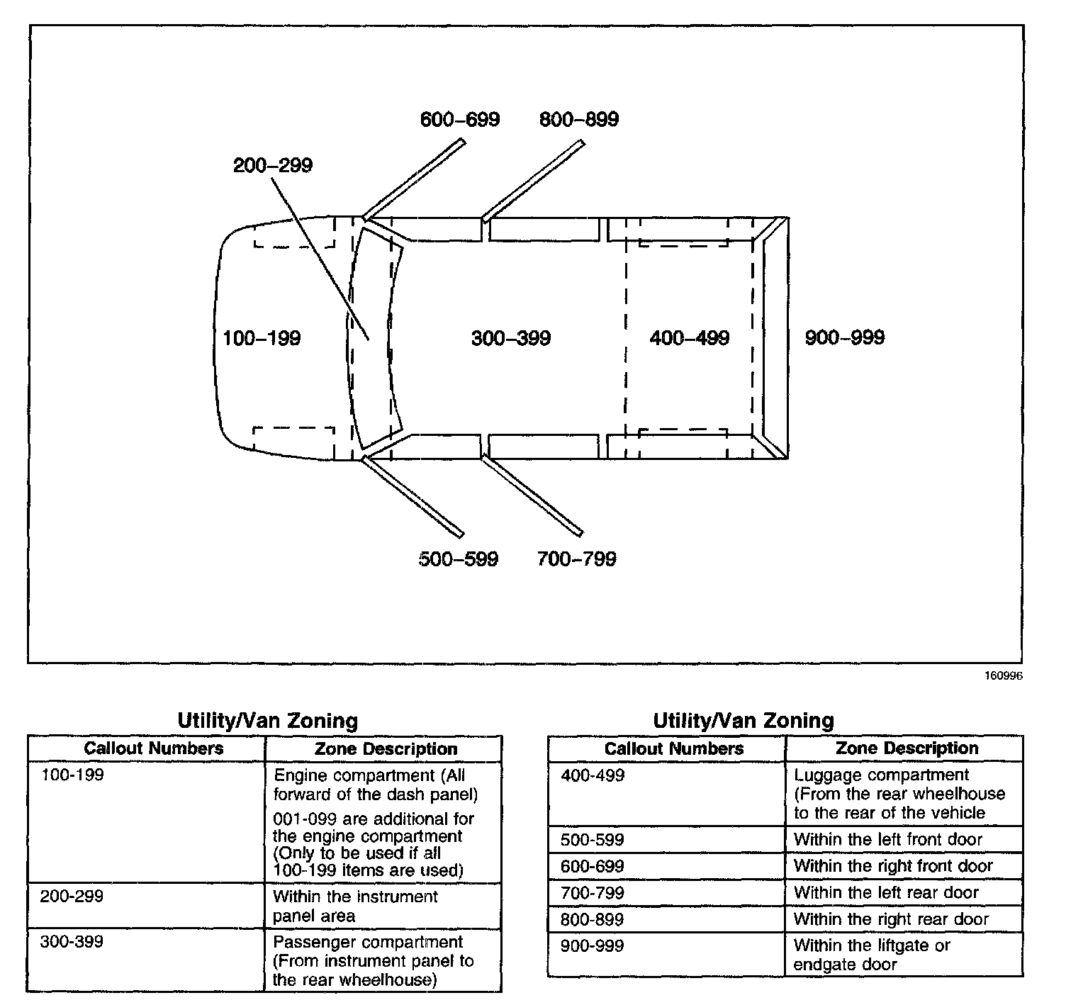 All grounds, in-line connectors, pass-through grommets, and splices have identifying numbers that correspond to where they are located in the vehicle. The table explains the numbering system.