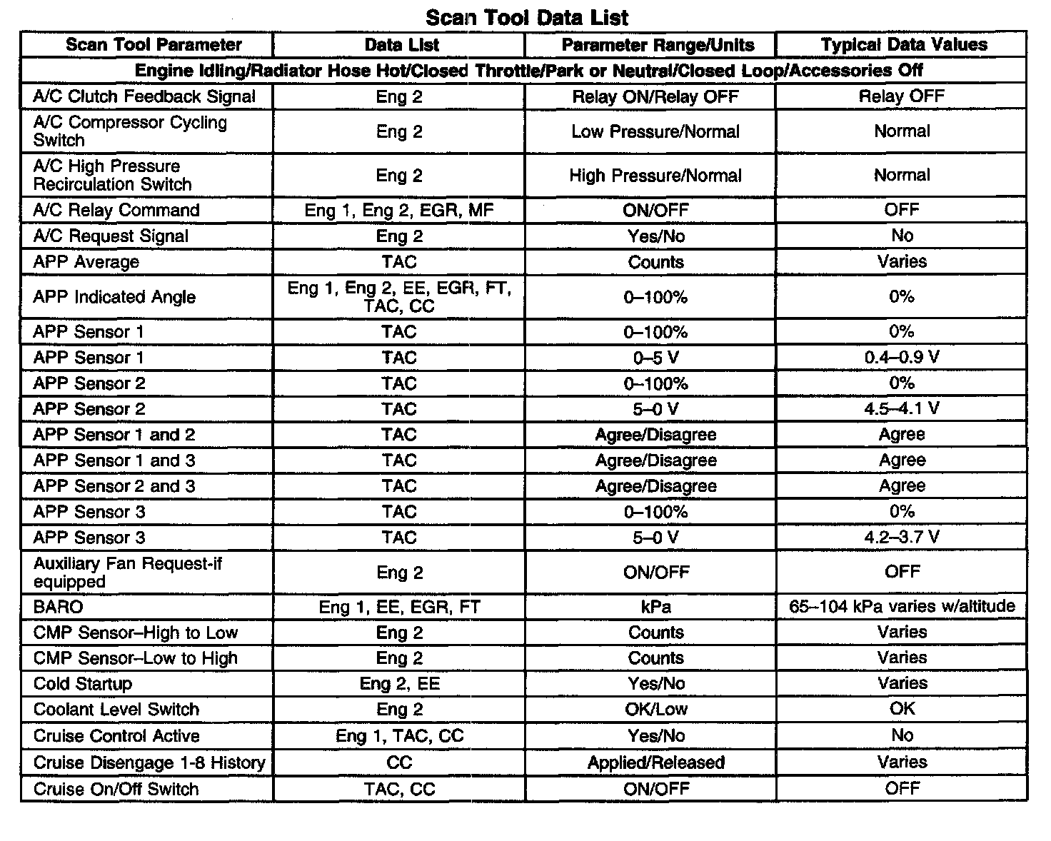 The Engine Scan Tool Data List contains all engine related parameters that are available on the scan tool. The list is arranged in alphabetical order. A given parameter may appear in any one of the data lists, and in some cases may appear more than once, or in more than one data list in order to group certain related parameters together.