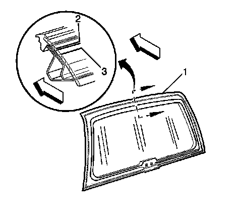 5. With the aid of an assistant remove the window (1) from the closed liftgate. Remove the C-clips from the liftgate window hinges, NOT from the liftgate.