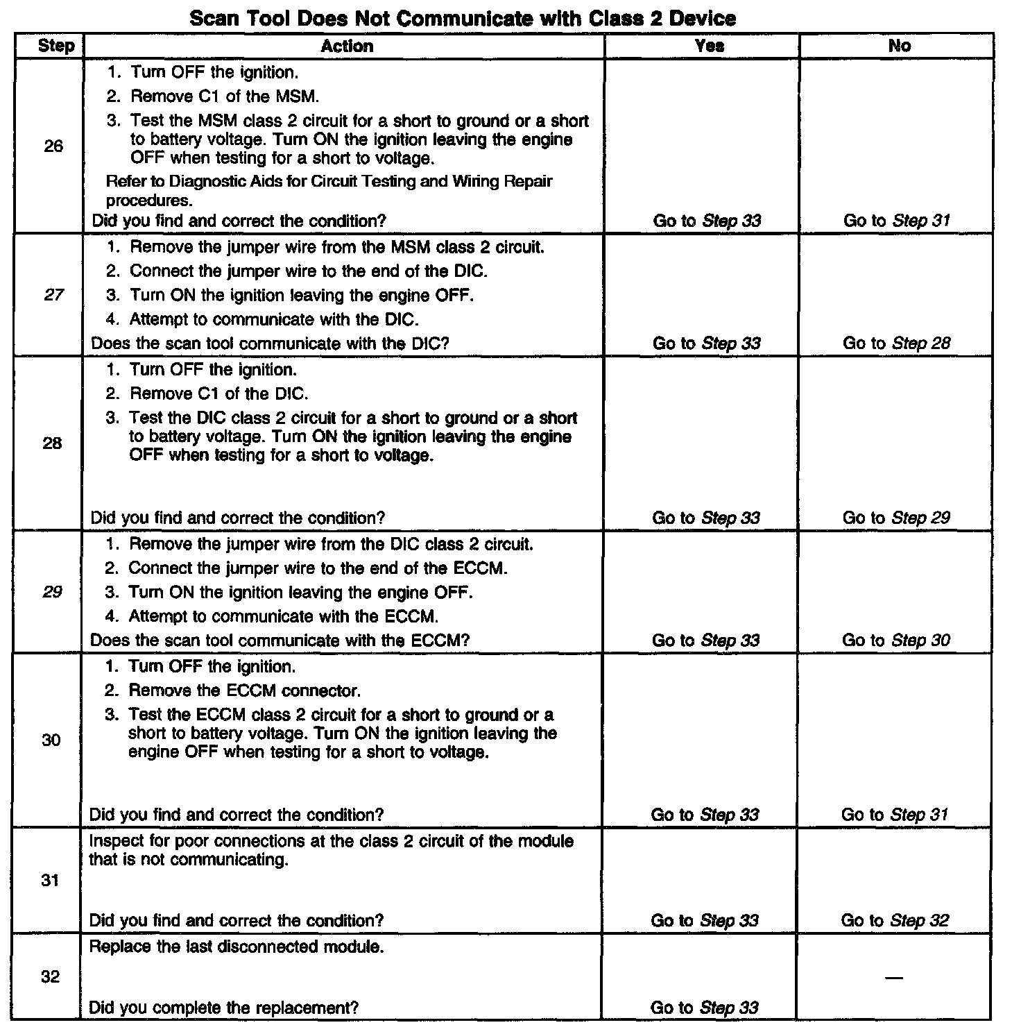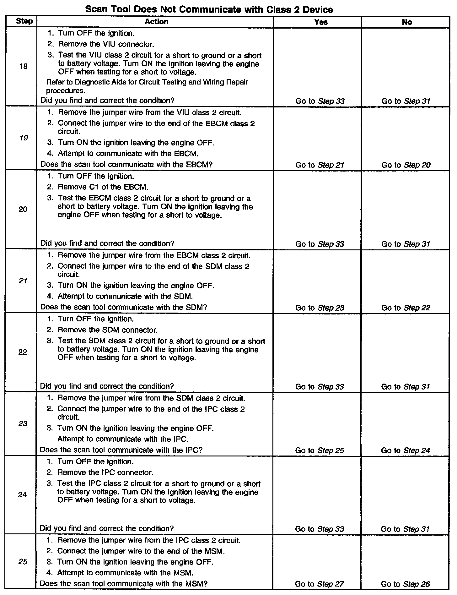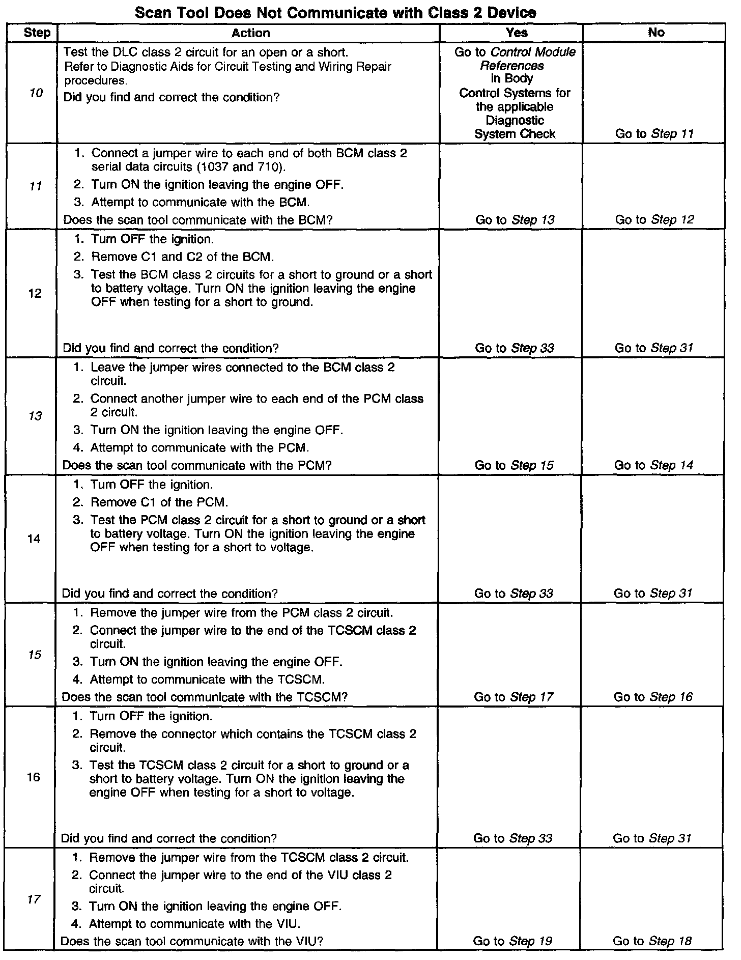 11. The class 2 circuit is shorted to battery positive voltage or battery negative voltage. The condition may be due to the wiring or due to a malfunction in one of the modules. When testing the wire for a short, make sure there is not a module connected to the wire being tested. This test isolates the BCM class 2 circuit.