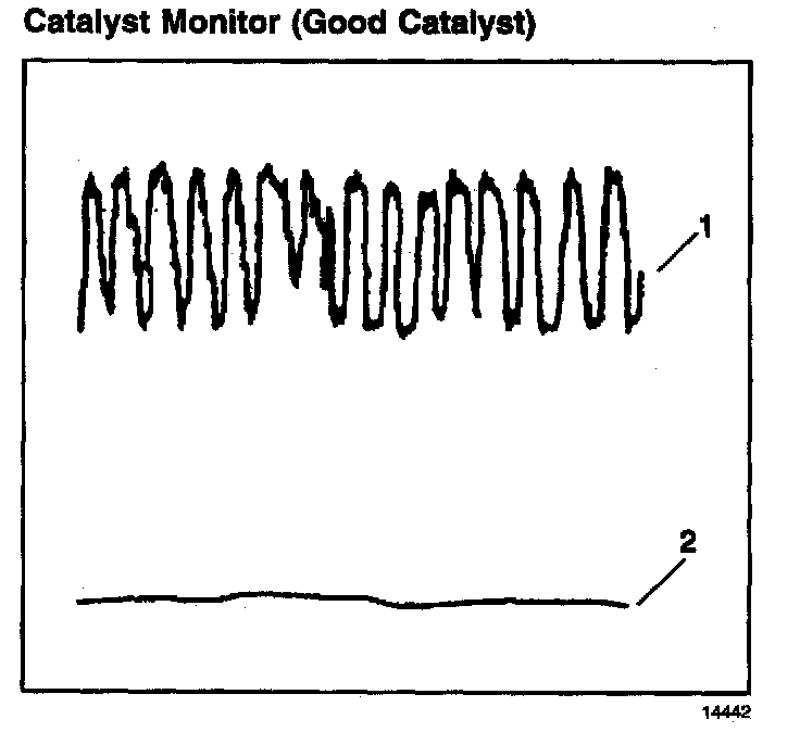 A good TWC catalyst will show a very active output voltage on the pre-catalyst heated oxygen sensor (1). A good catalyst, 95 percent hydrocarbon conversion, will show a relatively flat output voltage on the post-catalyst heated oxygen sensor (2).