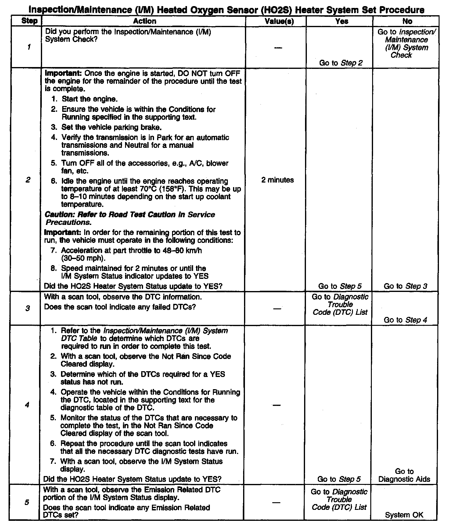 DESCRIPTIONThe purpose of this test is to satisfy the enable criteria necessary to execute I/M readiness diagnostics for the Heated Oxygen Sensor (HO2S) System. The test may be used to set the I/M System Status to YES. Ensure the vehicle meets the requirements listed in Conditions for Running before performing this test. Failure to meet the necessary requirements may produce inaccurate test results.