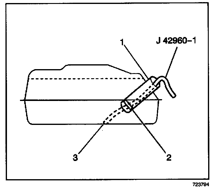 10. Insert the J 42960-1 into the neck of the fuel tank (1).