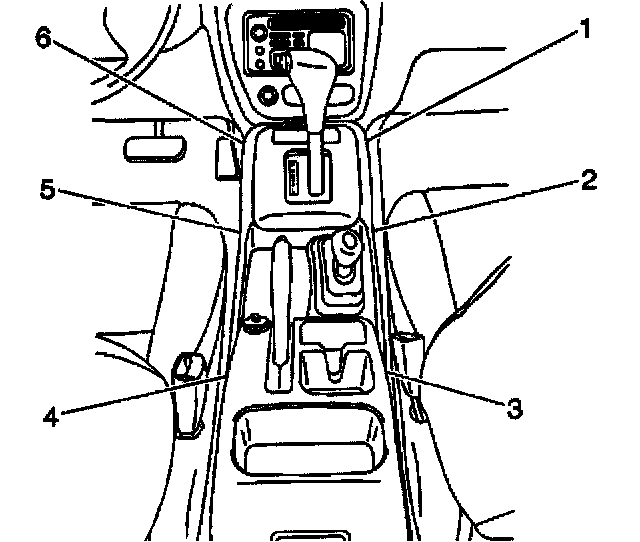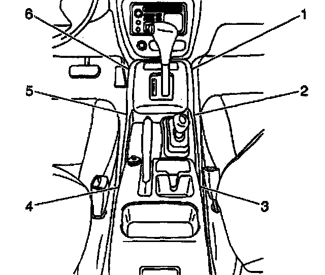 3. Remove the center console screws (1, 6) and the clips (2, 5).