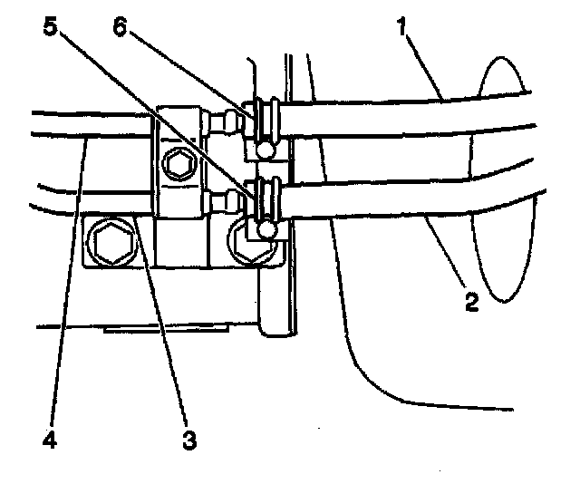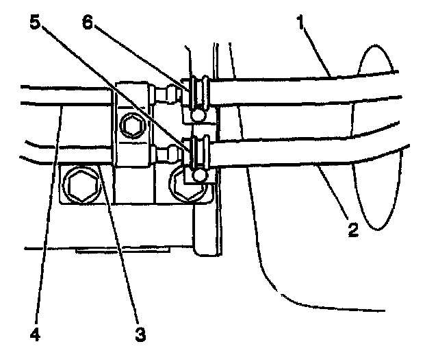 9. Install the cooler hoses (1, 2) and the clamps (5, 6) to the transmission cooler pipes (3, 4).
