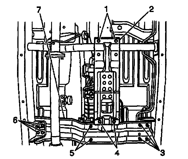 23. Remove the 10 crossmember bolts (3, 5, 6) and the crossmember (7).