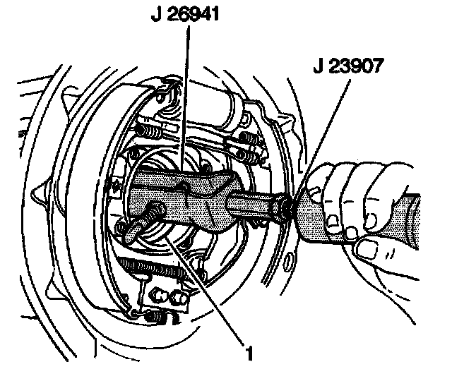 9. Remove both of the rear axle shaft inner oil seals (1) from the rear axle housing with the J 26941 and the J 23907.