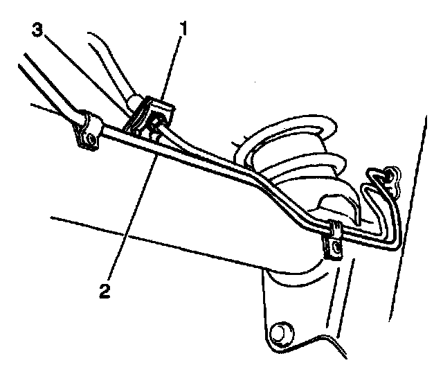 18. Remove the 1 clip (1) and the brake fluid hose from the rear axle housing brake fluid hose bracket (3).