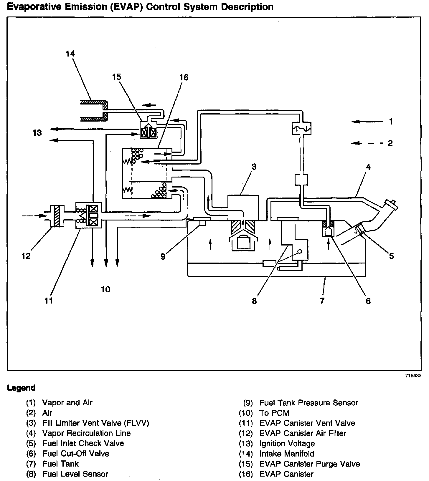 The Evaporative Emission (EVAP) control system limits fuel vapor emissions to the atmosphere. The EVAP system transfers the fuel vapor from a sealed fuel tank to an activated carbon (charcoal) storage device (EVAP canister). The EVAP canister will store the fuel vapors until the engine is able to use them.