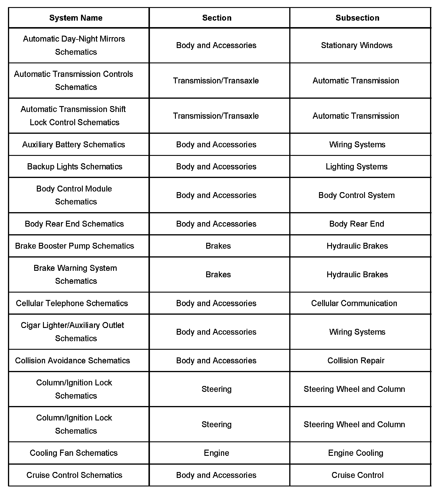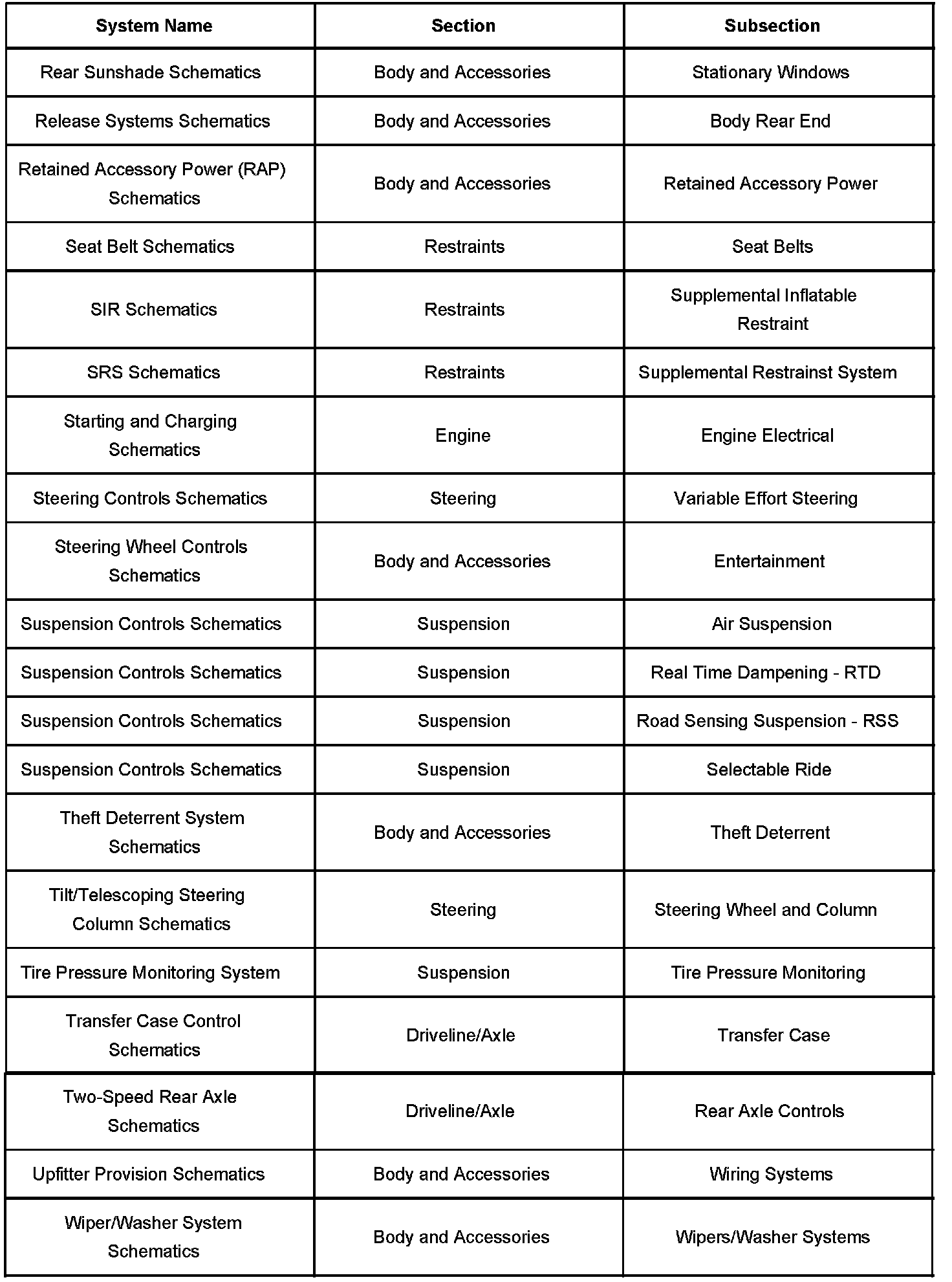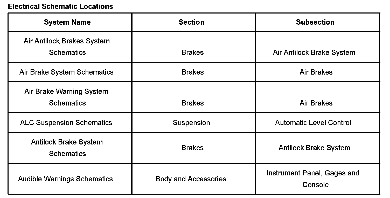 Electrical system schematics are located within their respective subsections. Because more than one electrical system is located in each subsection, each electrical systems schematics are further broken down into operating systems. The table lists all electrical system schematics and the subsection in which they are located.