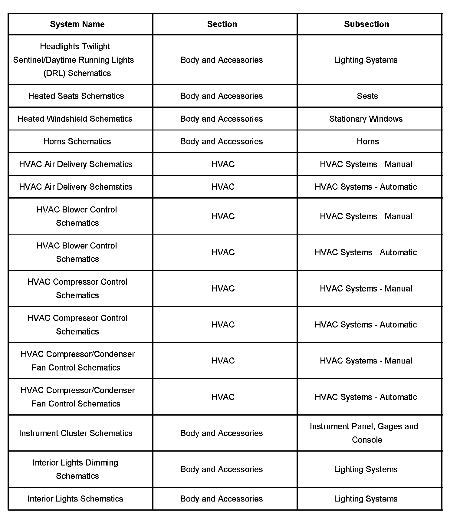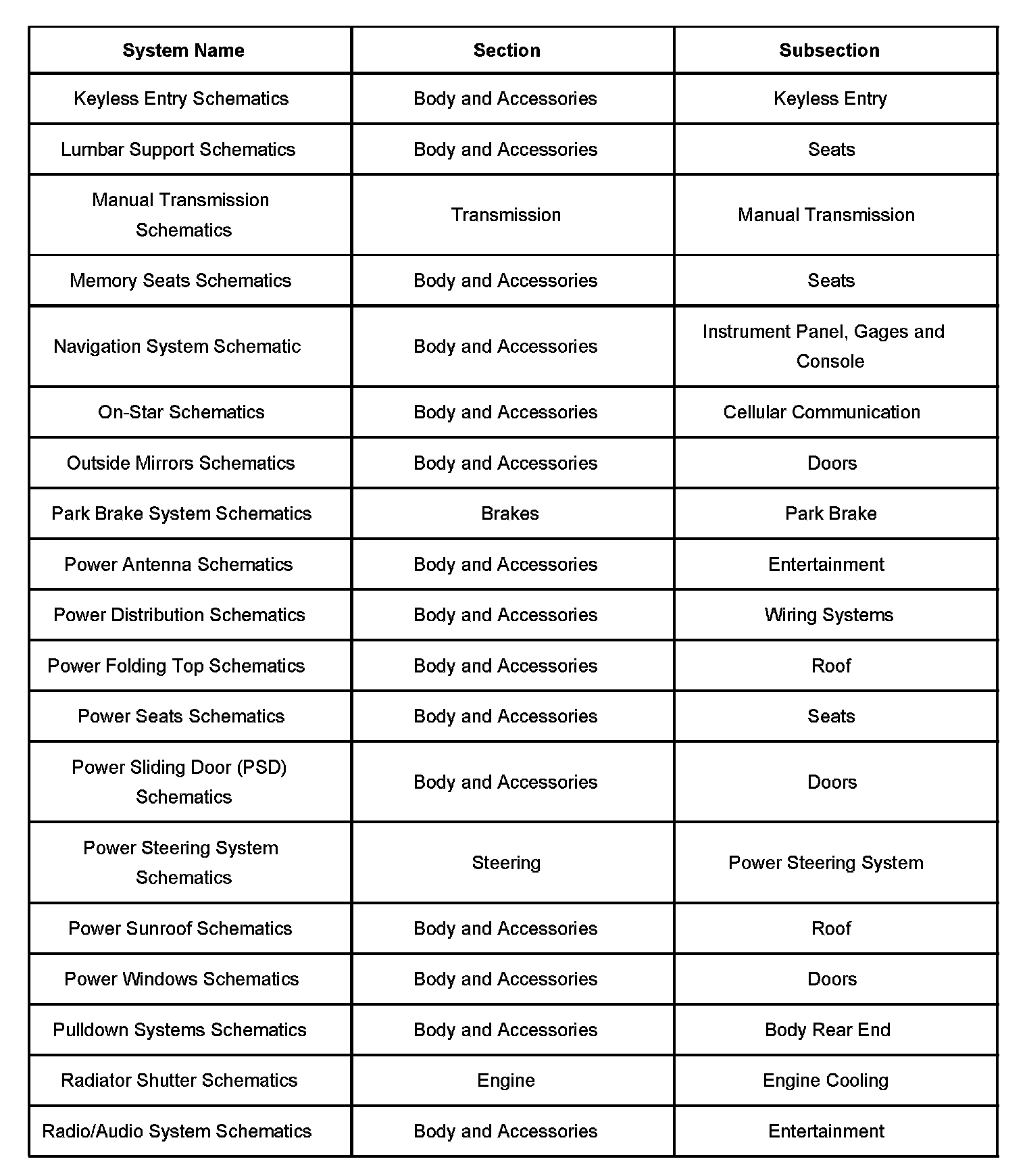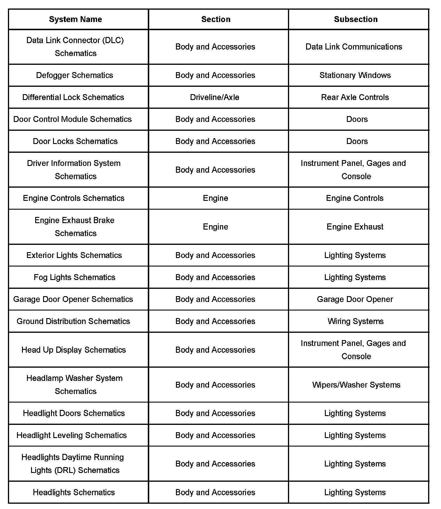 Electrical system schematics are located within their respective subsections. Because more than one electrical system is located in each subsection, each electrical systems schematics are further broken down into operating systems. The table lists all electrical system schematics and the subsection in which they are located.