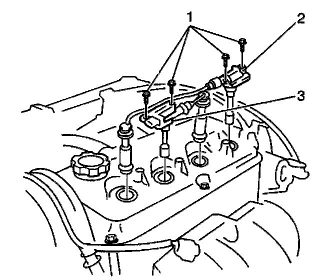 3. Remove the two bolts (1) that secure the ignition coil 1(2) or the ignition coil 2 (3) to the valve cover.