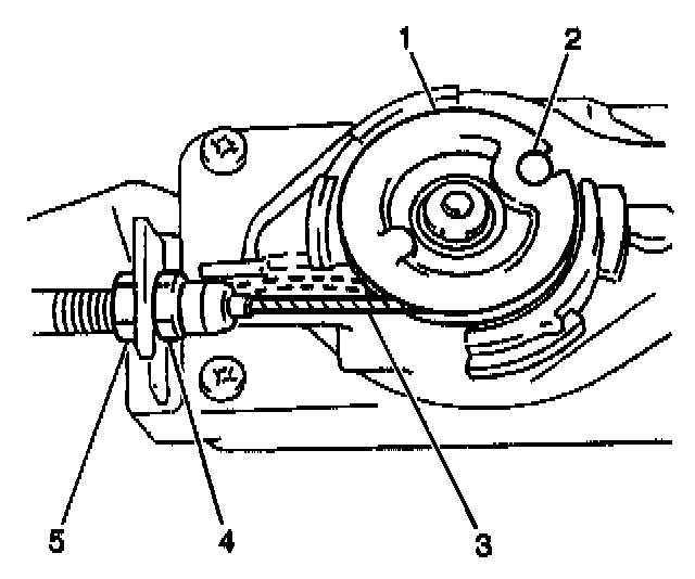 4. Adjust the cruise control servo cable locknuts (5) in order to adjust the cruise control servo cable play.