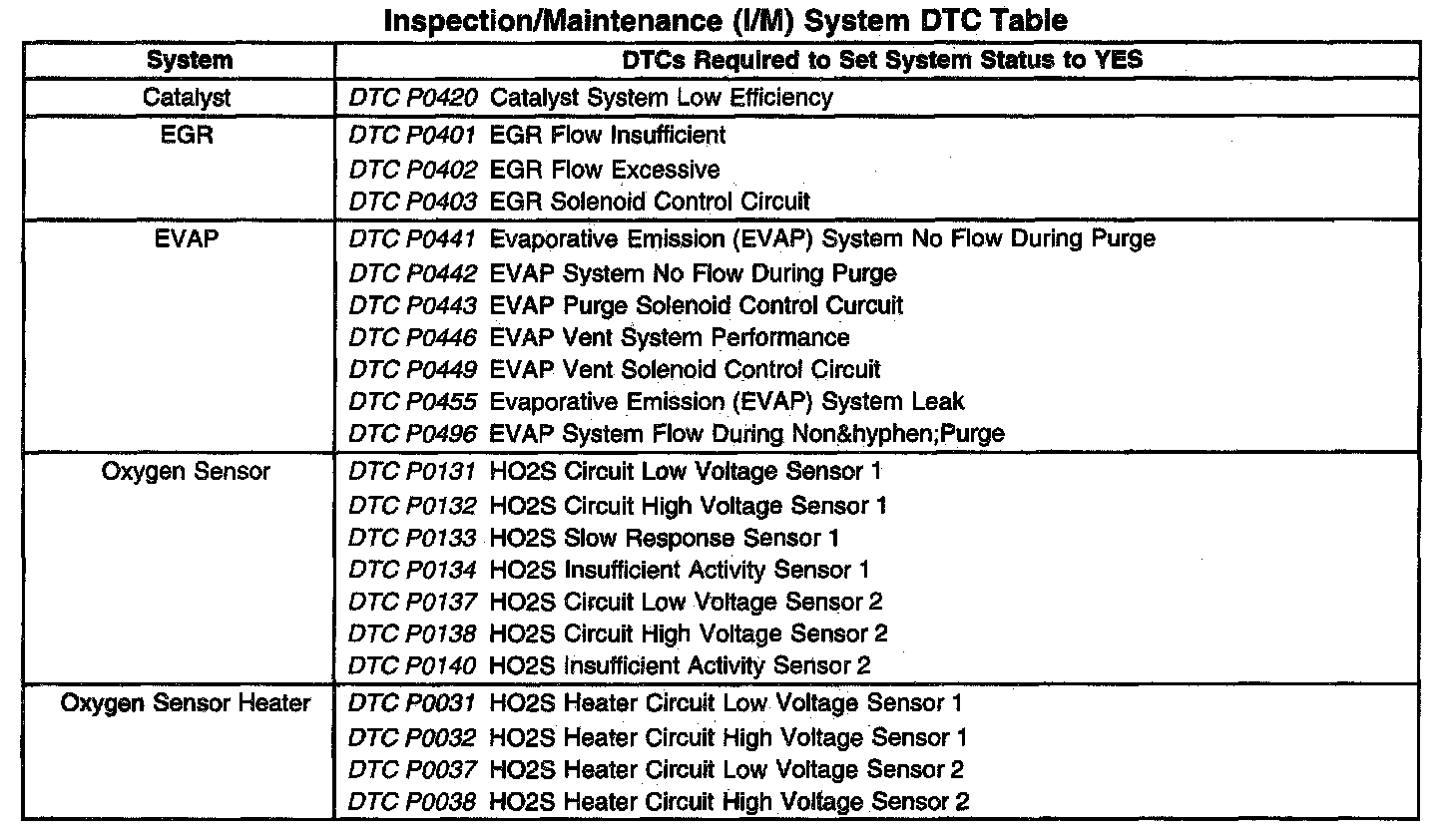 Inspection/Maitenance (I/M) System (DTC) Table