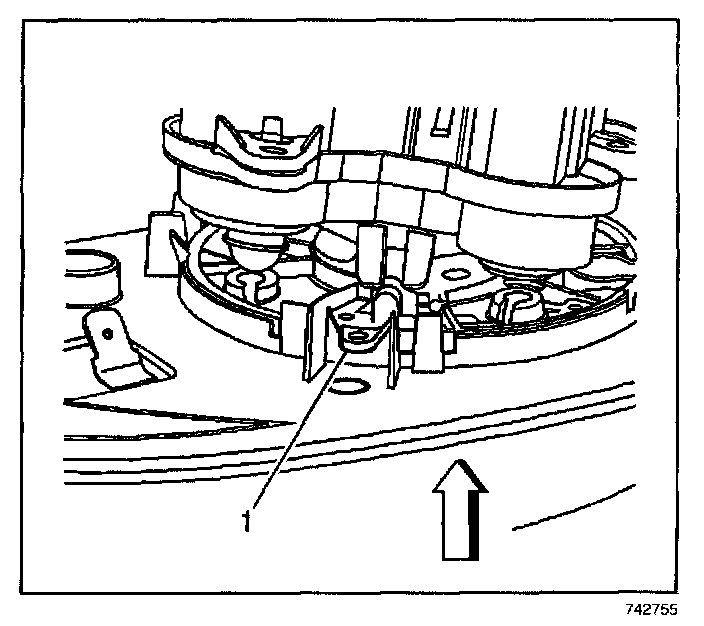 1. Manually tilt the top edge of the left mirror glass away from the mirror housing in order to gain access to the upper mirror glass retaining tab. Carefully release the upper glass retaining tab (1) using a flat-bladed tool while simultaneously tilting the mirror glass away from the mirror housing. Refer to the illustration above.