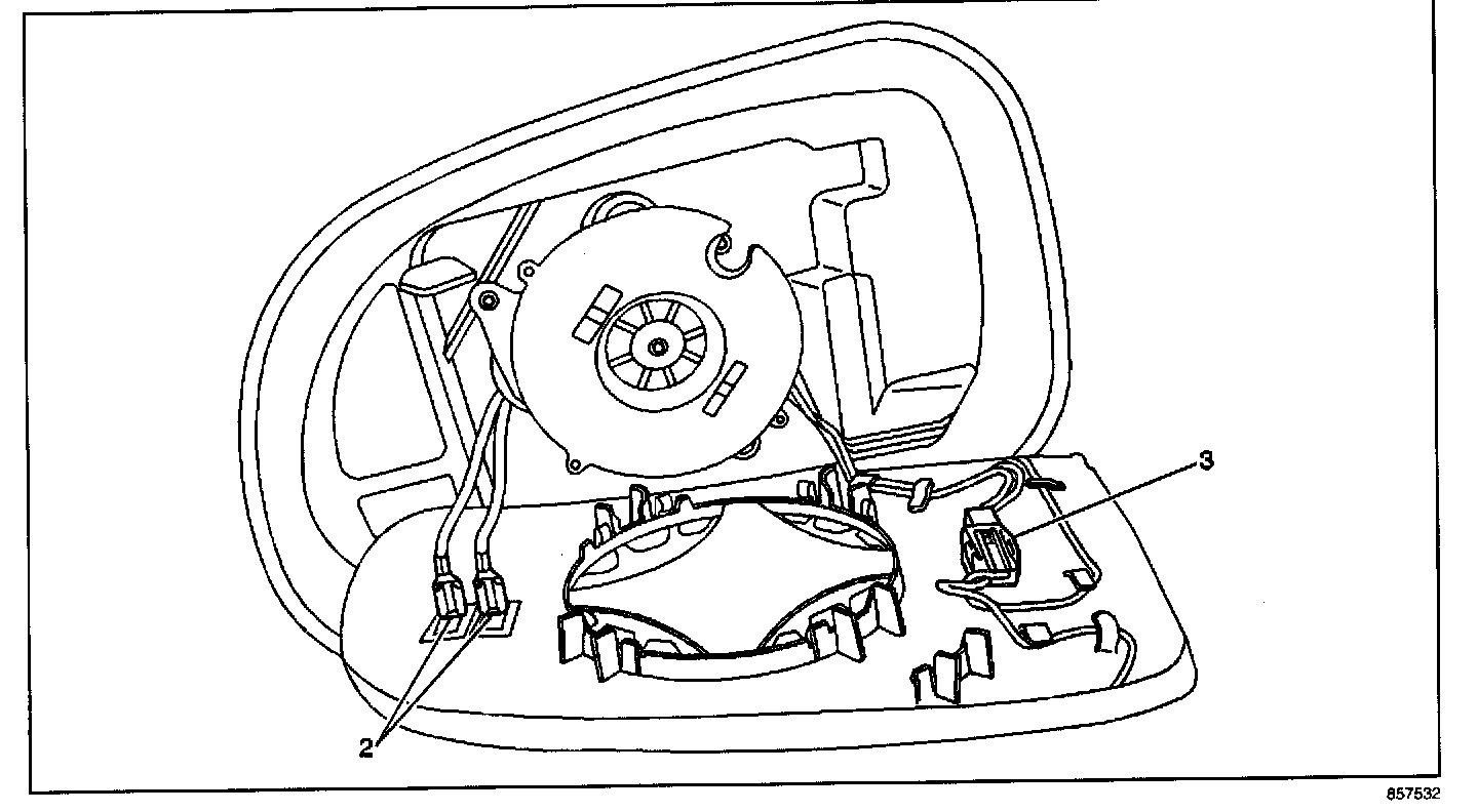 3. Disconnect the two mirror heater wires (2) from the mirror glass while holding down the terminals on the glass. The terminals may pull off the mirror glass it they are not held in place. Unclip the electrochromic mirror wire harness connector (3) from the back of the mirror glass and disconnect it. Refer to the illustration above.