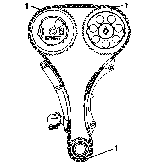 14. Align the dark link of the timing chain with the timing mark on the exhaust camshaft actuator (1).