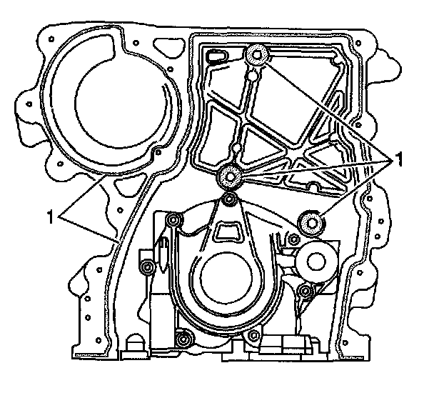2. Apply a 3 mm (0.12 inch) bead of sealer GM P/N 12378521 to the trace grooves on back side of the engine front cover (1).
