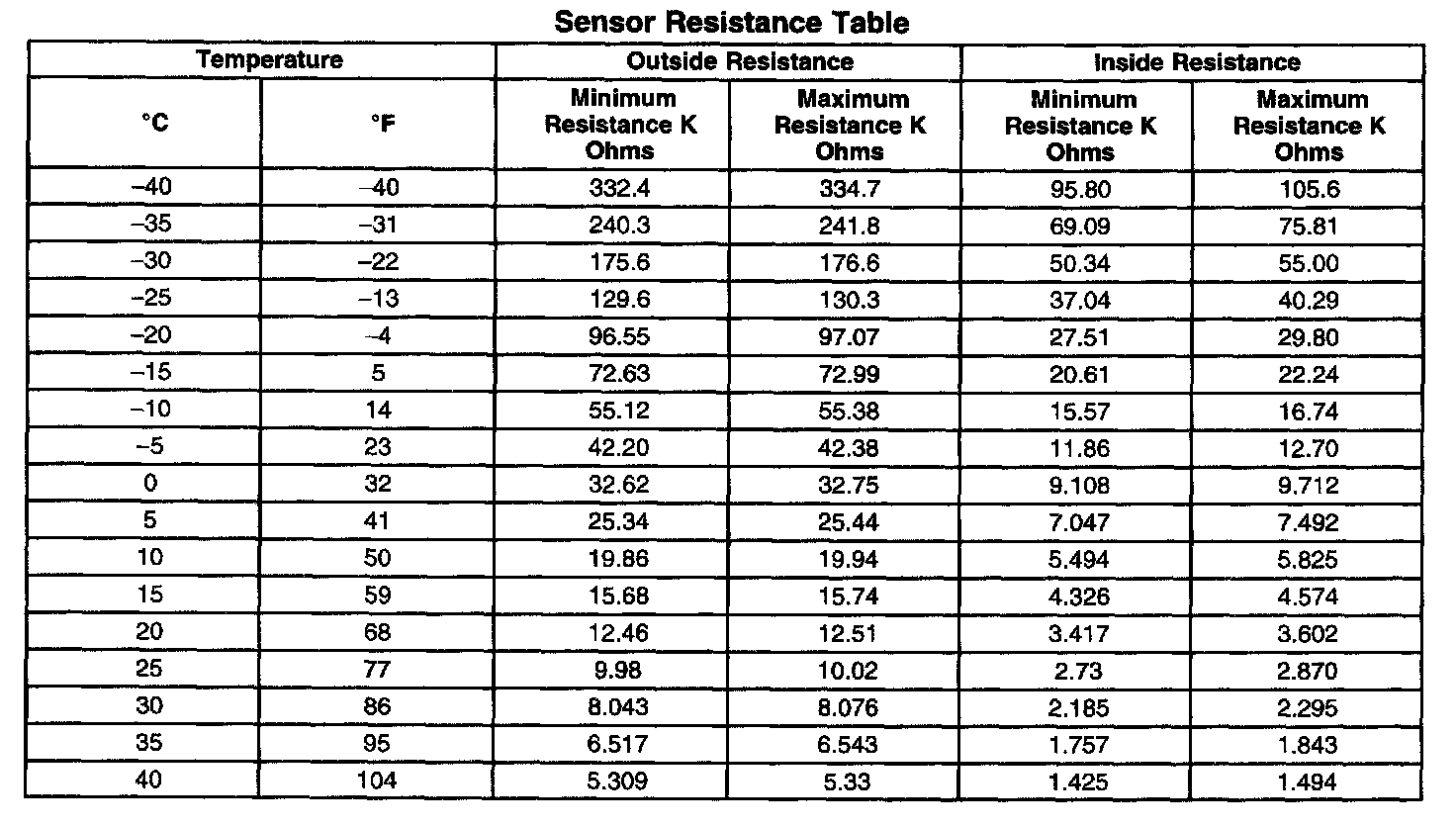 Sensor Resistance Table - HVAC Systems - Automatic: