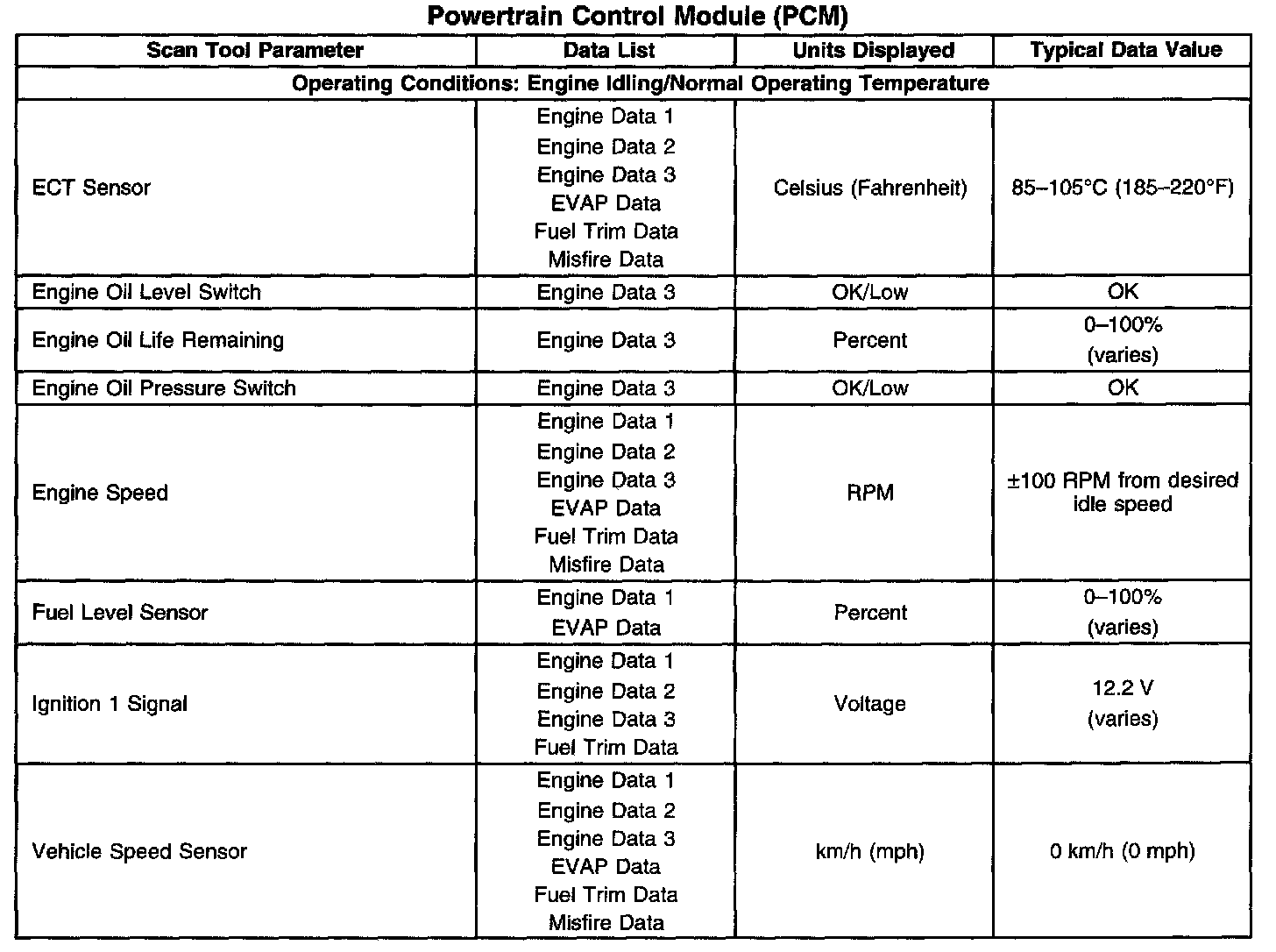 Scan Tool Data List - Powertrain Control Module (PCM)