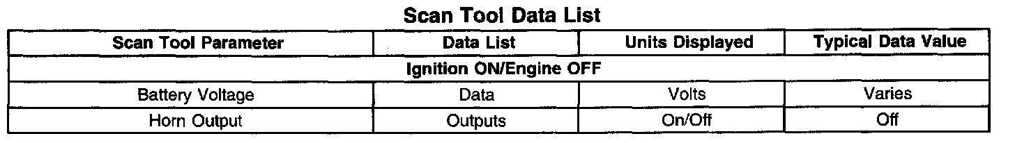 The Horns Scan Tool Data List contains all of the horn related parameters that are available on the scan tool. The parameters in the list are arranged in alphabetical order. The column, "Data List," indicates the location of the parameter within the scan tool menu selections. Use the Horns Scan Tool Data List as directed by a diagnostic table or in order to supplement the diagnostic procedures. Begin all of the diagnostic procedures with Diagnostic System Check - Horns.