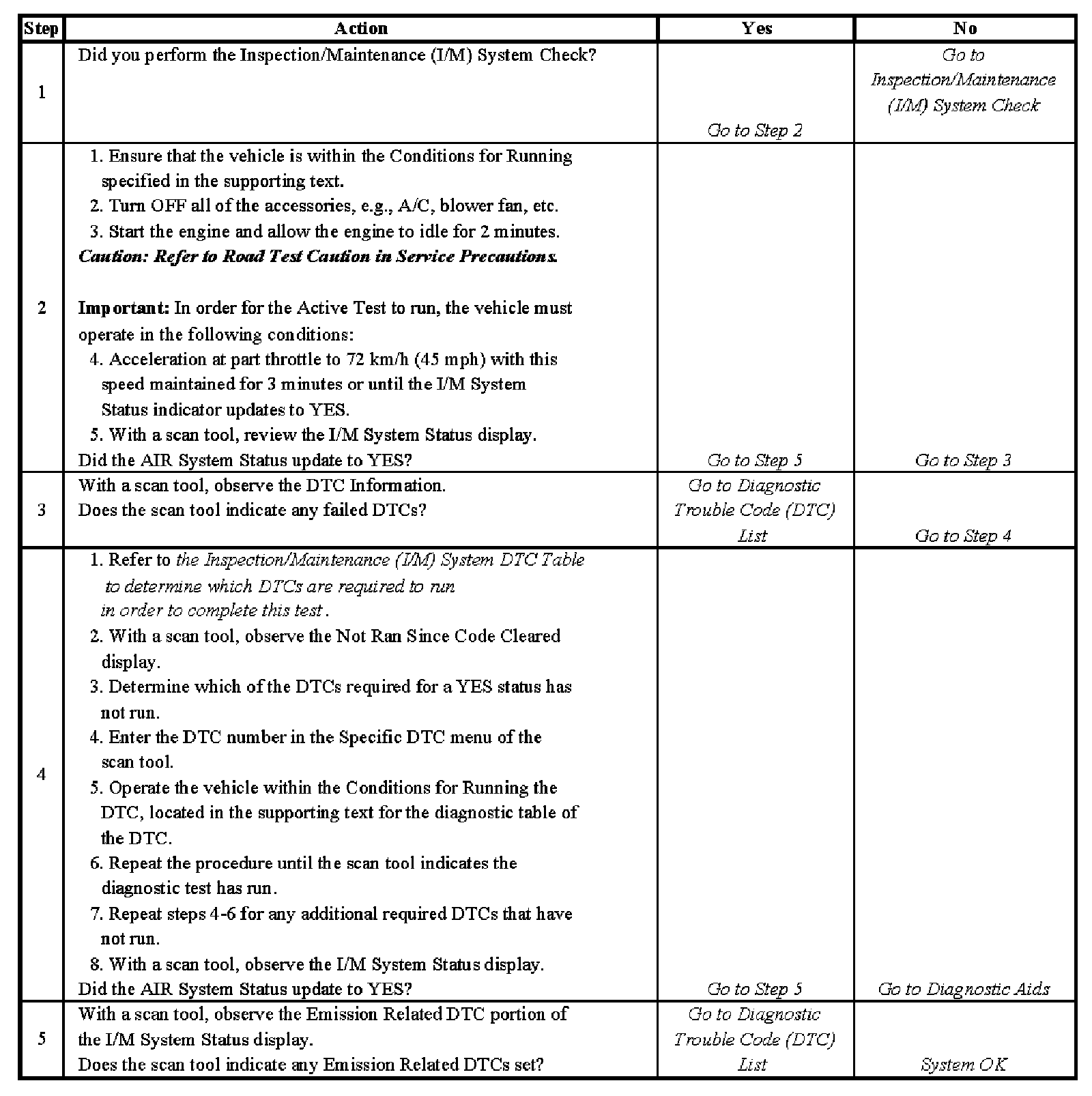 3. This step identifies a first failure of a type B DTC. A DTC only appears on the I/M System Status display when the DTC becomes a MIL illuminating DTC. This occurs on the second failure of a type B DTC. A first failure of a type B DTC will not allow the I/M System Status to update to YES. Refer to Diagnostic Aids.