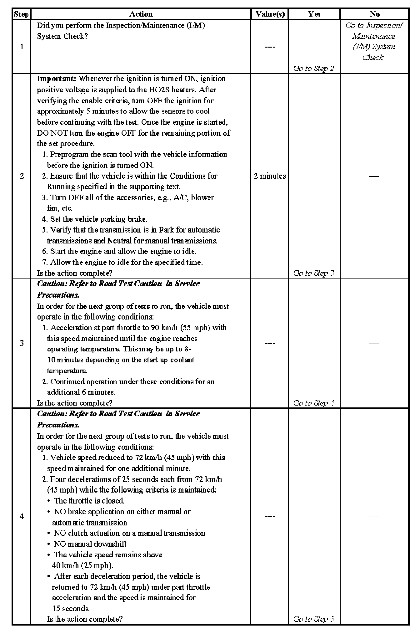 DESCRIPTIONThe purpose of the I/M Complete System Set Procedure is to satisfy the enable criteria necessary to execute all of the I/M readiness diagnostics, and complete the trips for those particular diagnostics. When all diagnostic tests are completed, the I/M System Status indicators are set to YES. Perform this test when more than one or all of the I/M System Status indicators are set to NO.