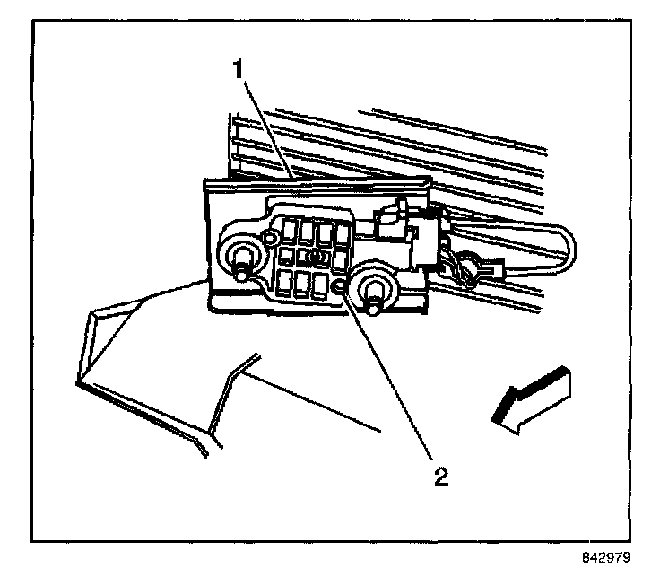 6. Install the 2 bolts (1) retaining the discriminating sensor assembly to the frame.