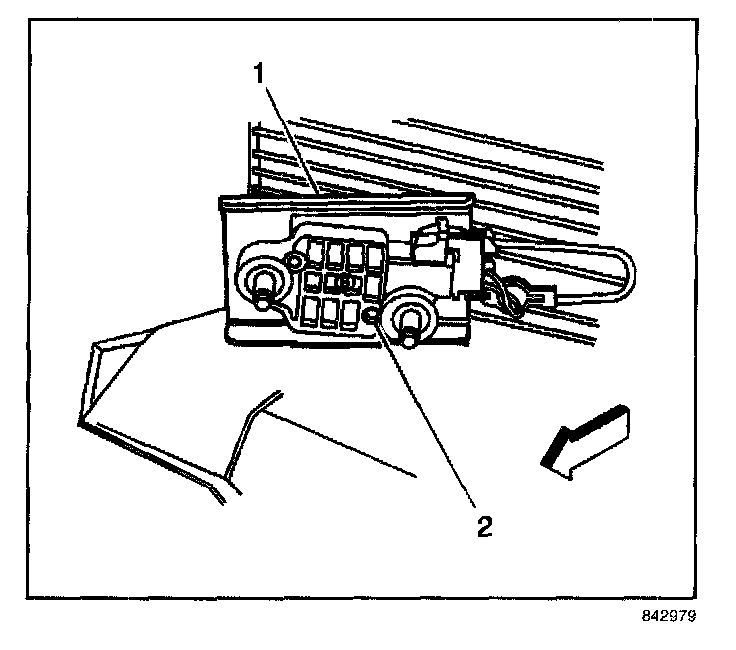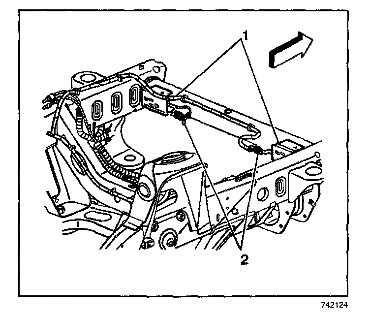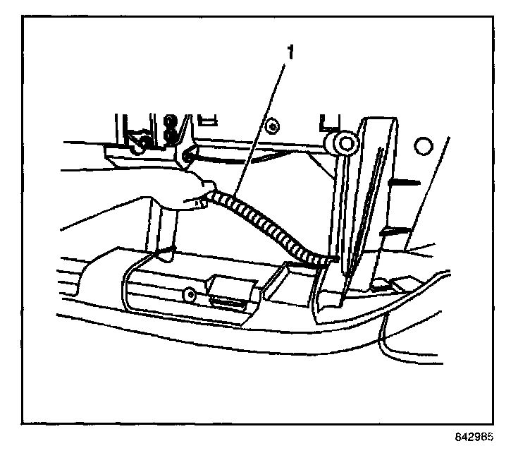 4. Raise and support the headlamp wire harness (1) to gain access to the front end discriminating sensor.