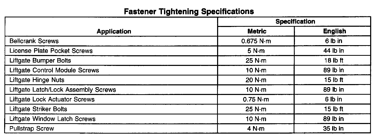 Fastener Tightening Specifications: