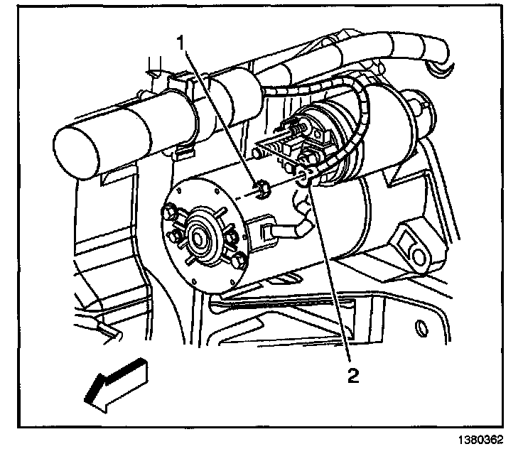 6. Remove the starter mount bolt and nut (1, 2).