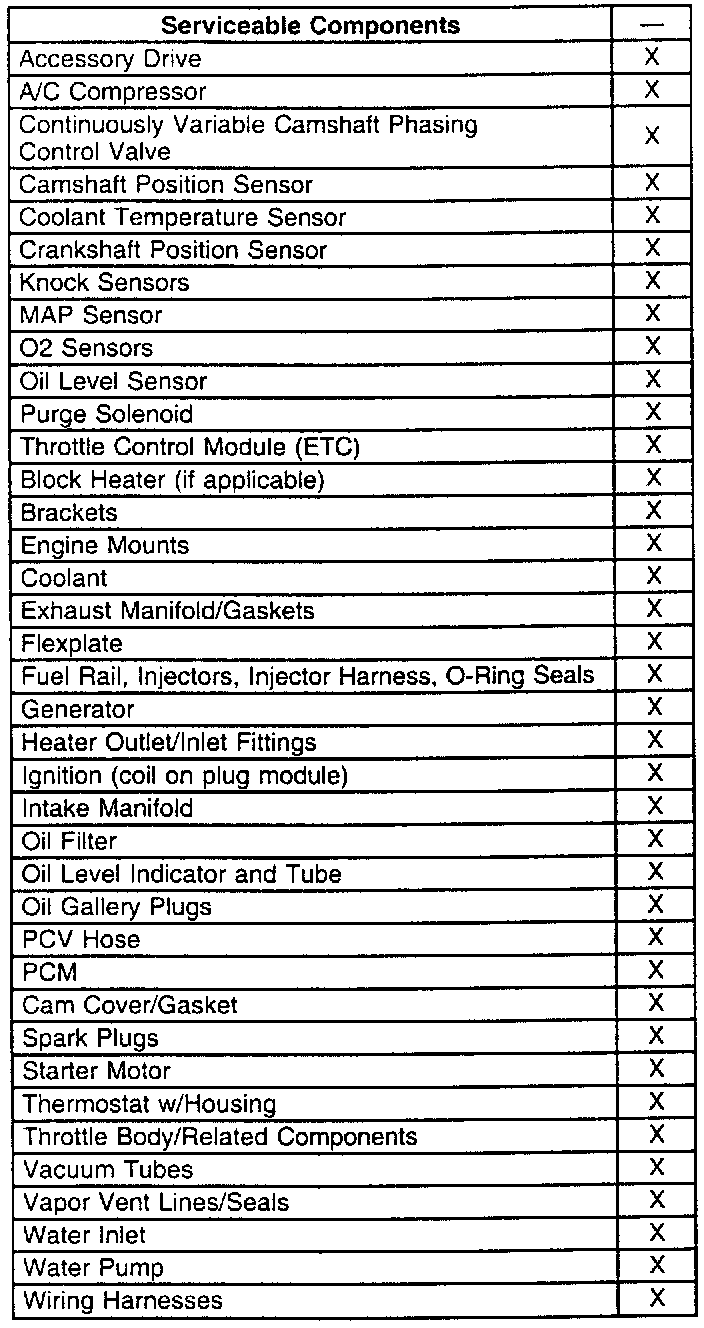 Engine components on the Serviceable Components list above must be serviced according to the repair procedures in the applicable service information publication (manual). Engine components NOT included in the above list will require an engine exchange.