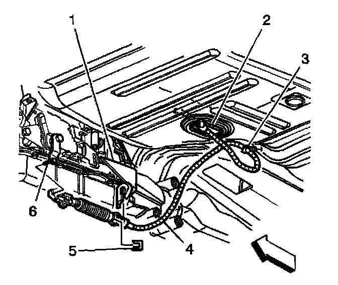 6. Remove the cable from the retainer (3) on the floor panel. If the vehicle is equipped with 4WD, remove the cable from the retainers located on the transfer case.
