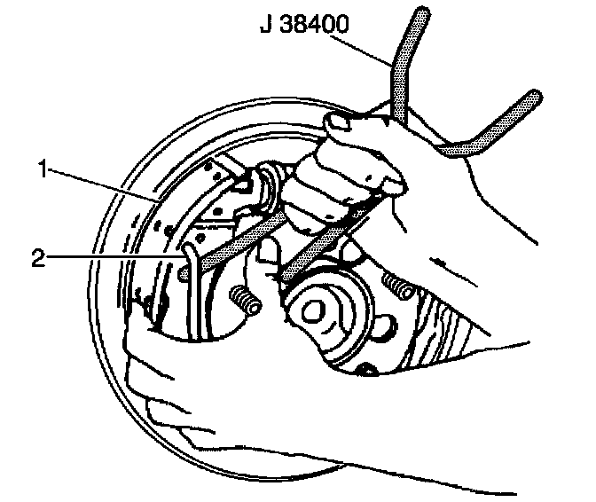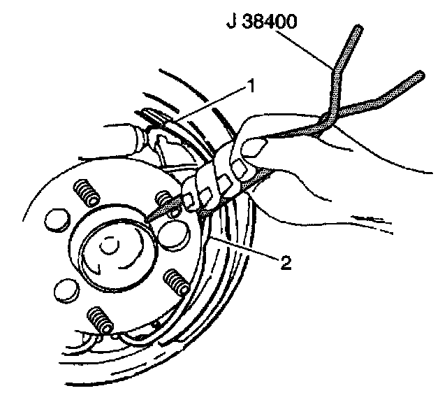 4. Remove the return spring (1). Use the J 38400 in order to pry the loop end of the adjuster spring from the adjuster actuator. Then disengage the adjuster spring from the web of the parking brake shoe.